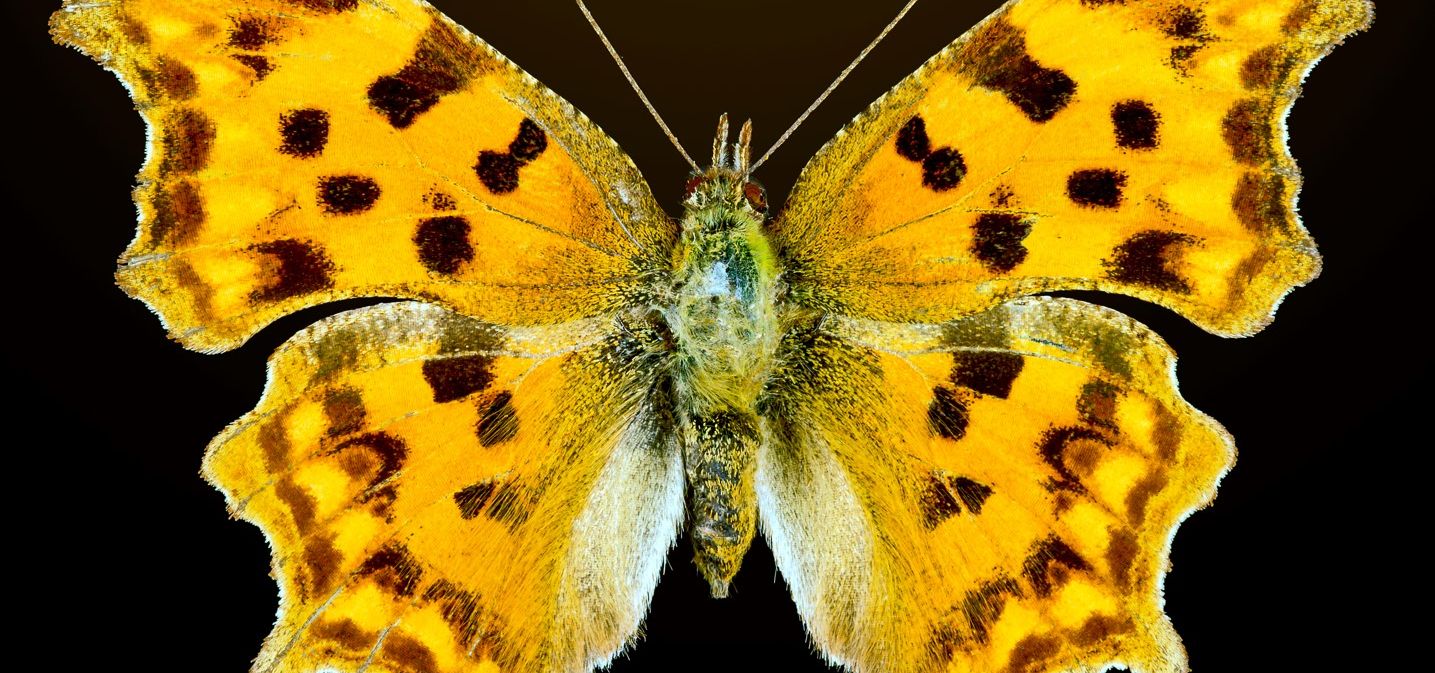 The “comma”, is a food generalist (polyphagous) butterfly. Both the larval and adult stages exhibit protective camouflage, mimicking bird droppings and fallen leaves respectively, which reduces predation. The hindwings have on the reverse side a white spot usually in the shape of a comma. The pupae are also cryptic, resembling shriveled leaves. During the later stage of development, the larvae also develop strong spines along their backs. The species is commonly found in Europe, North Africa, and Asia.