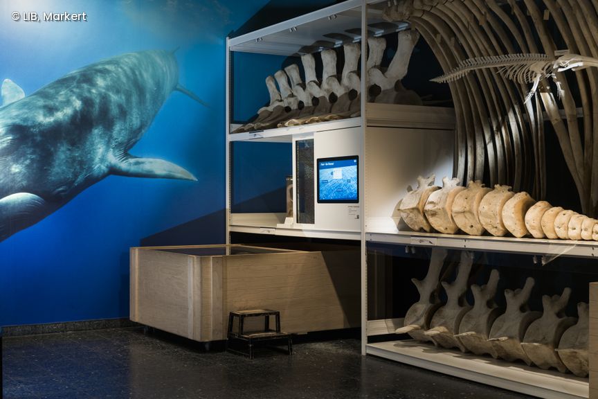 Die Lebensweisen und besonderen Fähigkeiten der Wale und Delfine, über die viel Seemannsgarn gesponnen wurde, sind Thema des Gesprächs. Die riesigen Skelette und Modelle der zoologischen Ausstellung vermitteln einen Eindruck von der natürlichen Größe dieser Meeressäuger. Hierzu werden einzelne Wale vermessen, damit die Teilnehmenden eine Vorstellung von ihrem Gewicht bekommen. Gemeinsam schauen wir uns Barten oder Zähne bestimmter Exemplare an und finden heraus, wie und was die betreffenden Wale fressen.