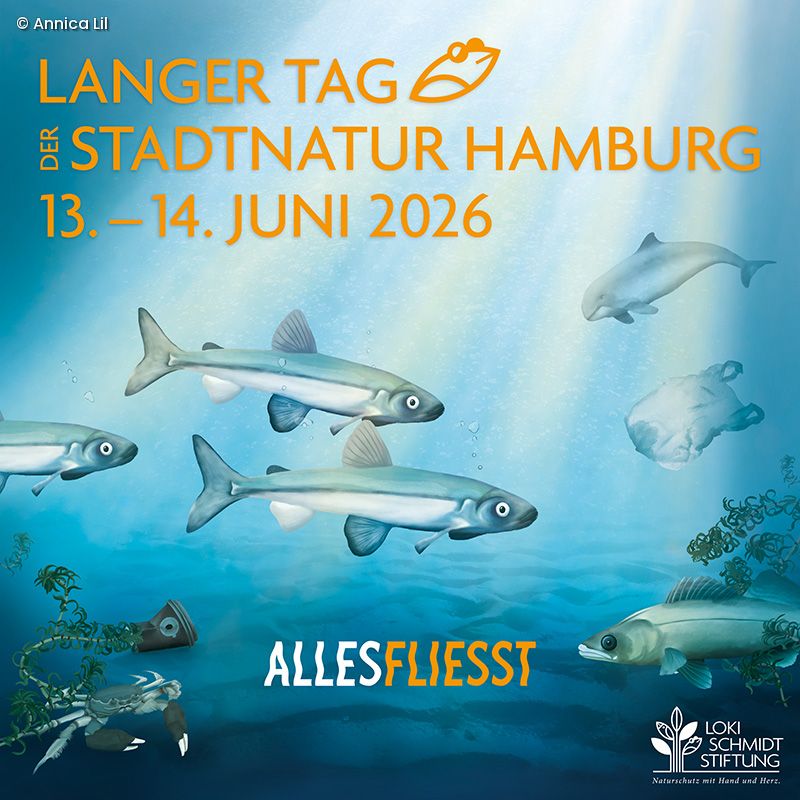 Hamburg: Zweistromland mit Elbe und Alster, Stadt der Kanäle, über die so viele Brücken führen wie sonst nirgendwo in Europa. Überall dort tobt das Leben, ebenso wie im Hafenbecken mitten in der Stadt, in den Seen im Umland, in Teichen, Tümpeln und Pfützen und selbst im kleinsten Wassertropfen. "Alles fließt." Unter diesem Motto stellen wir am Langen Tag der StadtNatur am 13.-14. Juni 2026 das Leben an und im Wasser in den Fokus.
